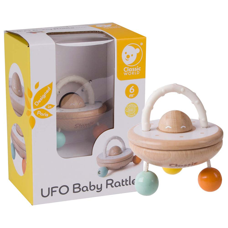 When baby waves this cute UFO rattle from Classic World it provides much entertainment as it attracts attention by stimulating colour and sound. A wonderful sensory tool.
