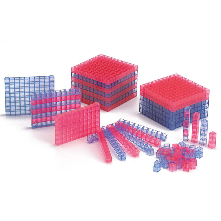 The Transparent Base Ten Starter Set allows the teacher to use the three-dimensional units, rods, and flats on the overhead projector. Students can better understand the deci-cube concept as one thousand units.