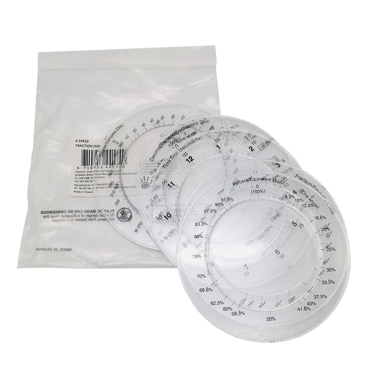 Six transparent fraction rings that work with our 51 piece fraction circle set to teach decimals, percents, fractions, time, compass degree and decimal percentage, with a clear base to hold pieces in place while moving around.