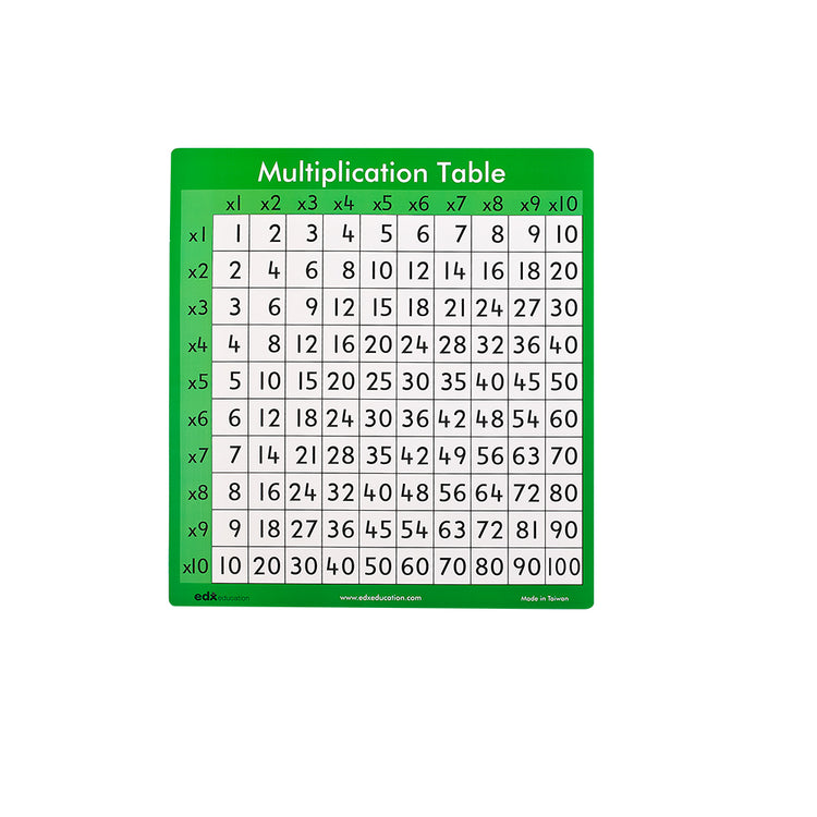 Double-sided, with a 10 x multiplication chart on one side and an empty table on the reverse side. Write-on/wipe-off laminated surface.