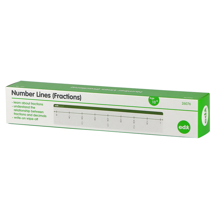 This classroom set of desk top Fraction Number Lines from EDX Education features 8 each of 1/16, 1/12, 1/10, 1/8, 1/4, 1¥4 to 1 and 1/2, 0.25 (1/4), 0.125 (1/8), and 0.1 (1/10).