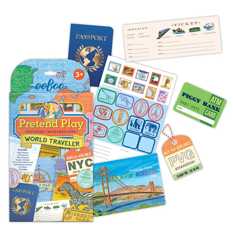 The World Traveller set includes tickets, postcards, travel documents and a play passport. Whether you want to roam the urban jungle of San Francisco, go on a wild safari in Kenya, or explore the ancient forests of Xanadu, the World Traveller Pretend Play Set will give you the tools you need to get there.
