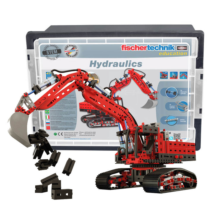 School and university students learn about hydraulic content with this realistic learning construction kit. The learning set offers hands-on technology for learning about the transfer of force using liquids. Five different models illustrate how signals and forces can be transferred with liquid media. Students can build a simple functional demonstration model, an excavator, and three other models. Combined with the accompanying pedagogical materials, the set teaches extensive skills and expertise on the topic of hydraulics. These accompanying materials are provided free of charge on the eLearning Portal to support teachers in preparing for and designing their curricula.