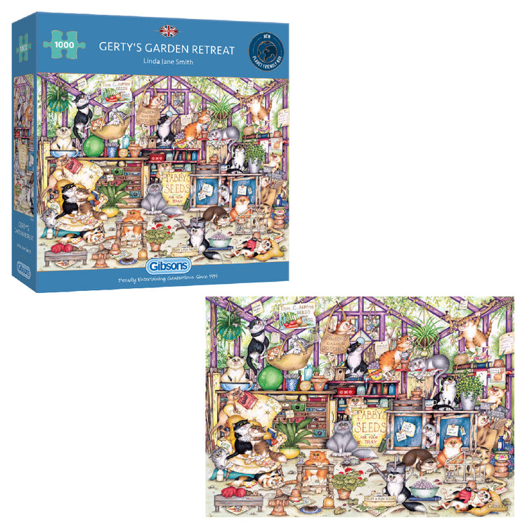 The cats have made this greenhouse their grotto in this charming 1000 piece jigsaw puzzle by Linda Jane Smith.