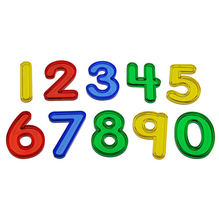 A set of colourful, translucent numbers. Each of the numbers measures approximately 5cm high. Excellent for promoting number recognition in young children.Ideal for use on a with the light panel.