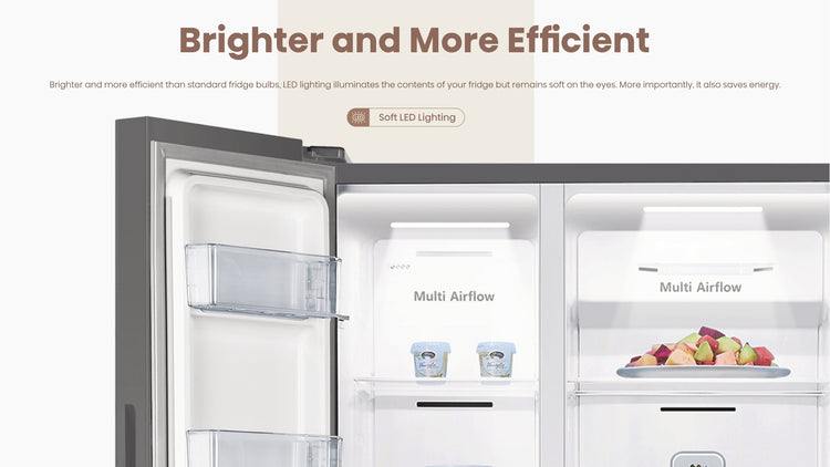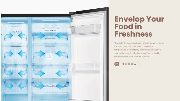Multi-Air Flow technology ensures even distribution of cool air throughout the fridge, maintaining a consistent temperature on every shelf. This feature keeps your food fresher for longer by eliminating warm spots.
