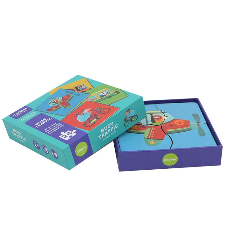 This progressive giant floor puzzle from Mideer depicts a panoramic traffic scene with multiple types of transportation across land and sea including a bike, car, helicopter and boat.