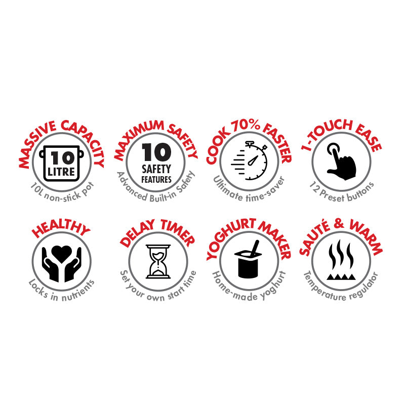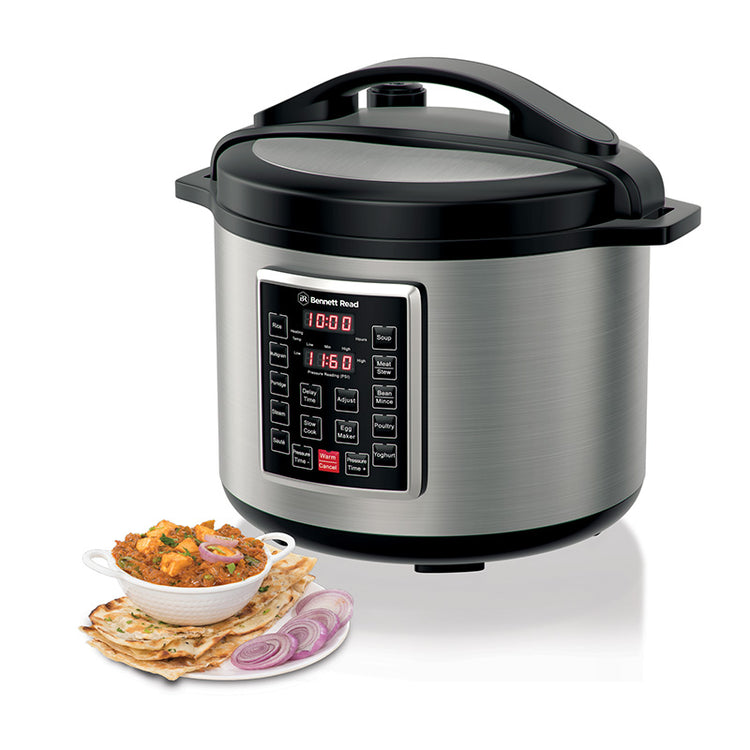 Intimidated and stressed out with the thought of making a massive family meal? Worried about the cooking time? Don’t be! Impress your entire family with the Bennett Read Super Chef 10 Plus pressure cooker! Enjoy delicious, healthy, tender, family-sized meals in just minutes! The Bennett Read Super Chef 10 Plus pressure cooker has an enormous non-stick 10 litre capacity pot, replaces up to 10 kitchen appliances and even cooks up to 70% faster with its hyper-pressure steam chamber. The 12 intelligent pre-programmed settings and 10 built-in safety features provide effortless 1-touch convenience and added peace of mind. Save on time, money and space by cooking in bulk and freezing your leftovers. Even throw in those frozen chicken wings and thighs... that’s right, this pressure cooker is able to cook food from frozen! How cool is that!?