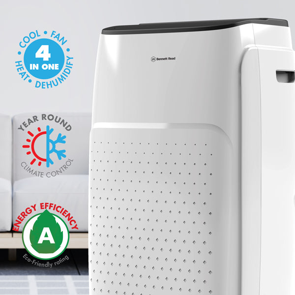 The powerful & portable system for fast & effective room cooling, refreshing, heating & dehumidifying. Versatile 4-in-1 climate control with portable convenience. Instantly cool, refresh, heat, & dehumidify your living spaces with the powerful Bennett Read® 12000BTU Portable Air Conditioner - the all-in-one, portable, climate-control solution. Equipped with precise cooling & heating power, fan, dehumidifier, timer functions, & fully-featured remote control, to ensure uninterrupted, personalised comfort & temperature control all year round. Versatile year-round solution. A powerful portable air conditioner, fan, heater & dehumidifier all wrapped up in one energy-efficient system that doesn’t require permanent installation. Easy-to-use controls. Control the comfort & climate of your environment with full feature led touch-control panel & remote control, each with convenient room temperature display! Auto on & auto shut-off timer. Set & forget the programmable timer function for up to 24 hours of precision performance. Adjustable auto-swing. Adjustable auto-swing air vents distribute air throughout a medium to large size room for coverage of up to 25m2. Easy to maintain & store. Built-in self-evaporative drainage tank* with easy-empty outlet, plus washable filters. Handy full water tank indicator provides overflow protection for peace of mind. Portable convenience. Smooth rolling castor wheels & built-in carry handles for ultimate versatility & ease-of-use in any space. Extended warranty. Your Bennett Read® 12000BTU Portable Air Conditioner comes standard with a 1 year warranty. Register your warranty online at www.bennettread.co.za & we’ll extend it to a full 2 years.* with easy-empty outlet, plus washable filters. Handy full water tank indicator provides overflow protection for peace of mind. Portable convenience. Smooth rolling castor wheels & built-in carry handles for ultimate versatility & ease-of-use in any space. Extended warranty. Your Bennett Read® 9000BTU Portable Air Conditioner comes standard with a 1 year warranty. Register your warranty online at & we’ll extend it to a full 2 years.