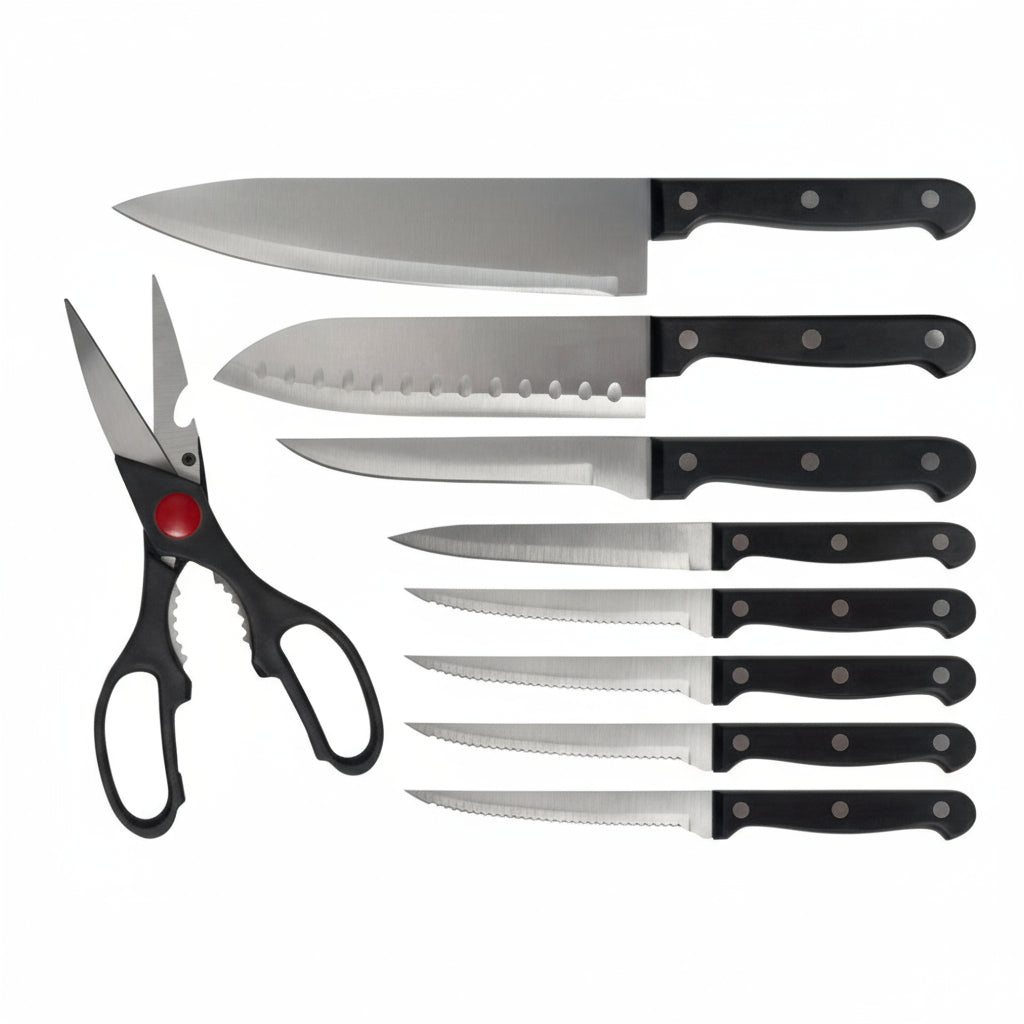 Upgrade your kitchen with the Homemax Power Chef Space-Saving Self-Sharpening 9-Piece Knife Block Set — designed for precision, durability, and convenience.