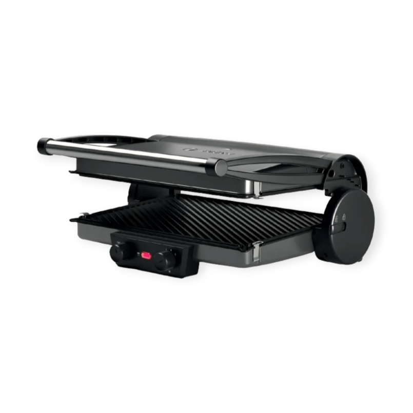 3-in-1 contact grill. Delicious cuisine in the wink of an eye. Healthy cuisine, quick cuisine, delicious cuisine – the contact grill's three grilling positions open up virtually boundless possibilities for trying out creative ideas. Closed as a contact grill, open as a table grill, with top and bottom heat to bake, gratinate or warm up – for frying, grilling, gratinating or heating. Juicy steaks, tasty hamburgers, crispy, golden brown satay skewers, toast, paninis, sandwiches or focaccia – enjoy whatever takes your fancy. In addition it features grilling plates that can be used on both sides making them especially suitable for low fat grilling. Delicious, low-fat and healthy.