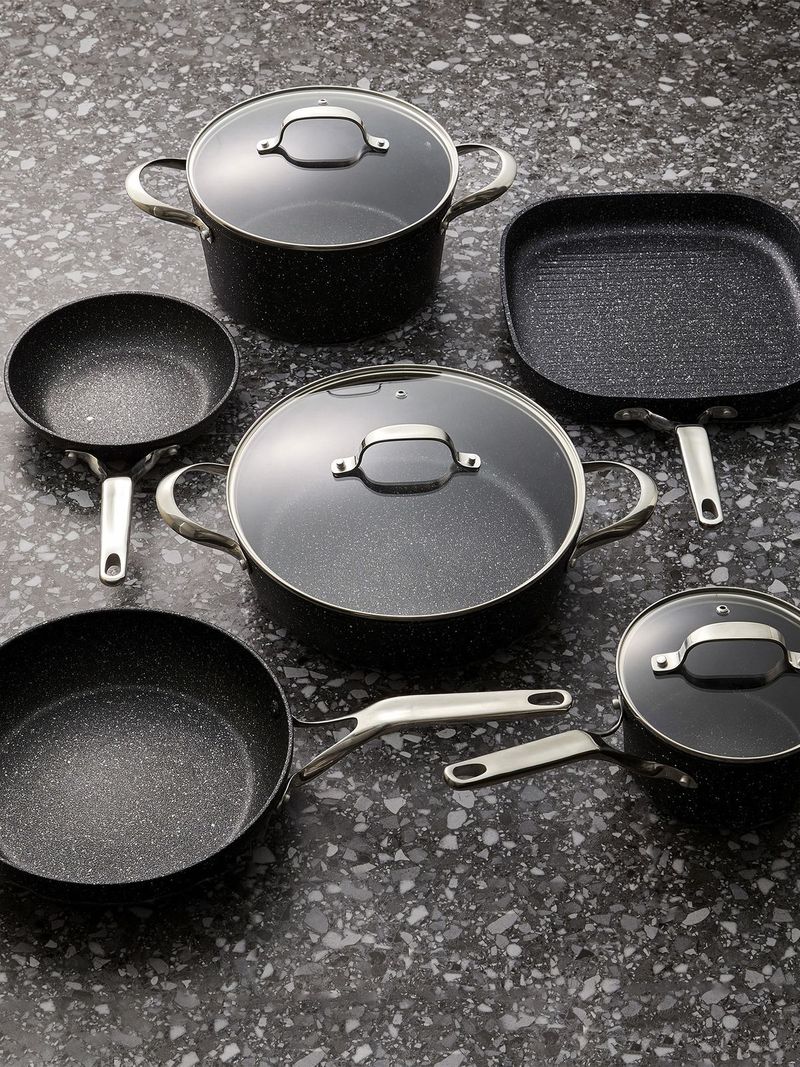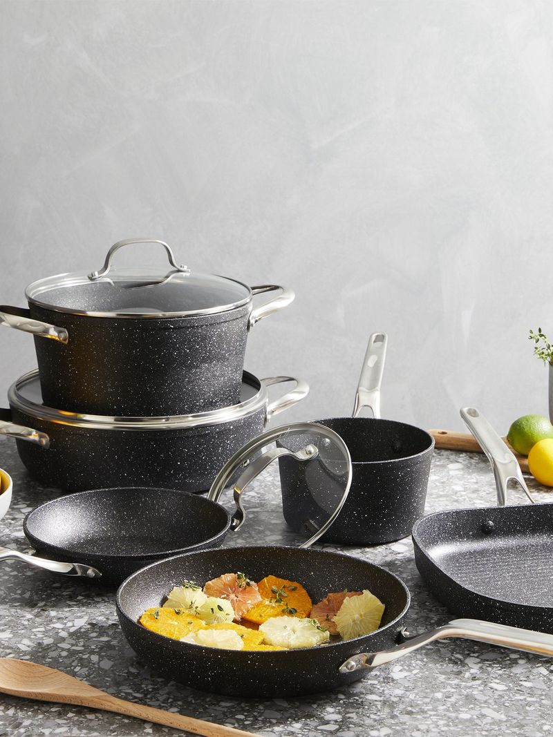 The Ironroc range is manufactured using small metal pellet impact technology to enhance the surface, forming an ultra-durable rock-like finish. The toughened and reinforced 3-layer non-stick surface offers outstanding durability and a lifetime of use. Stainless steel induction plates make this set suitable for all cooktops.