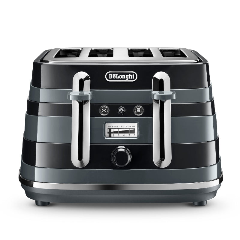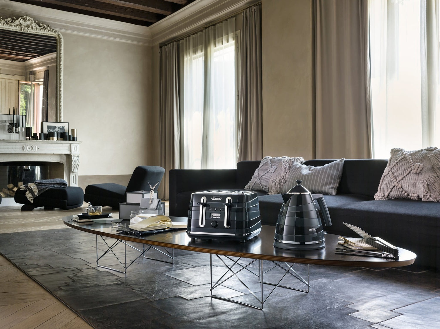 Italian craftsmanship is prominent in the distinctive treatment of this collection, translating to a smooth, curved silk-like pattern on the surface of this toaster.
