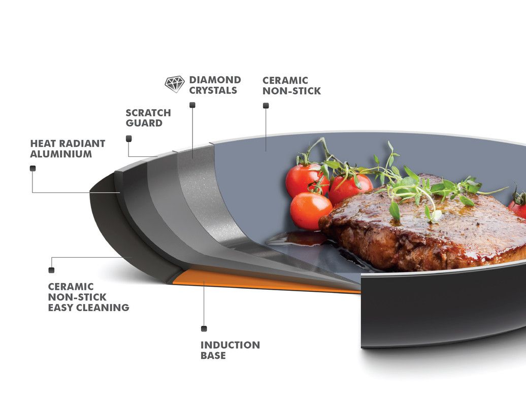 - Thermalon Infinity ceramic non-stick interior coating, enhanced with diamonds allow for extreme non-stick performance, quick heating and extra durability