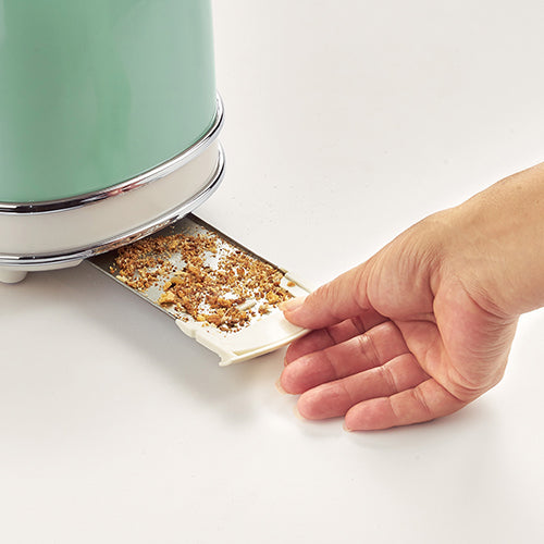 The toaster features 6 browning levels, as well as a defrost and heat function. It has a removable crumb tray for easy cleaning.