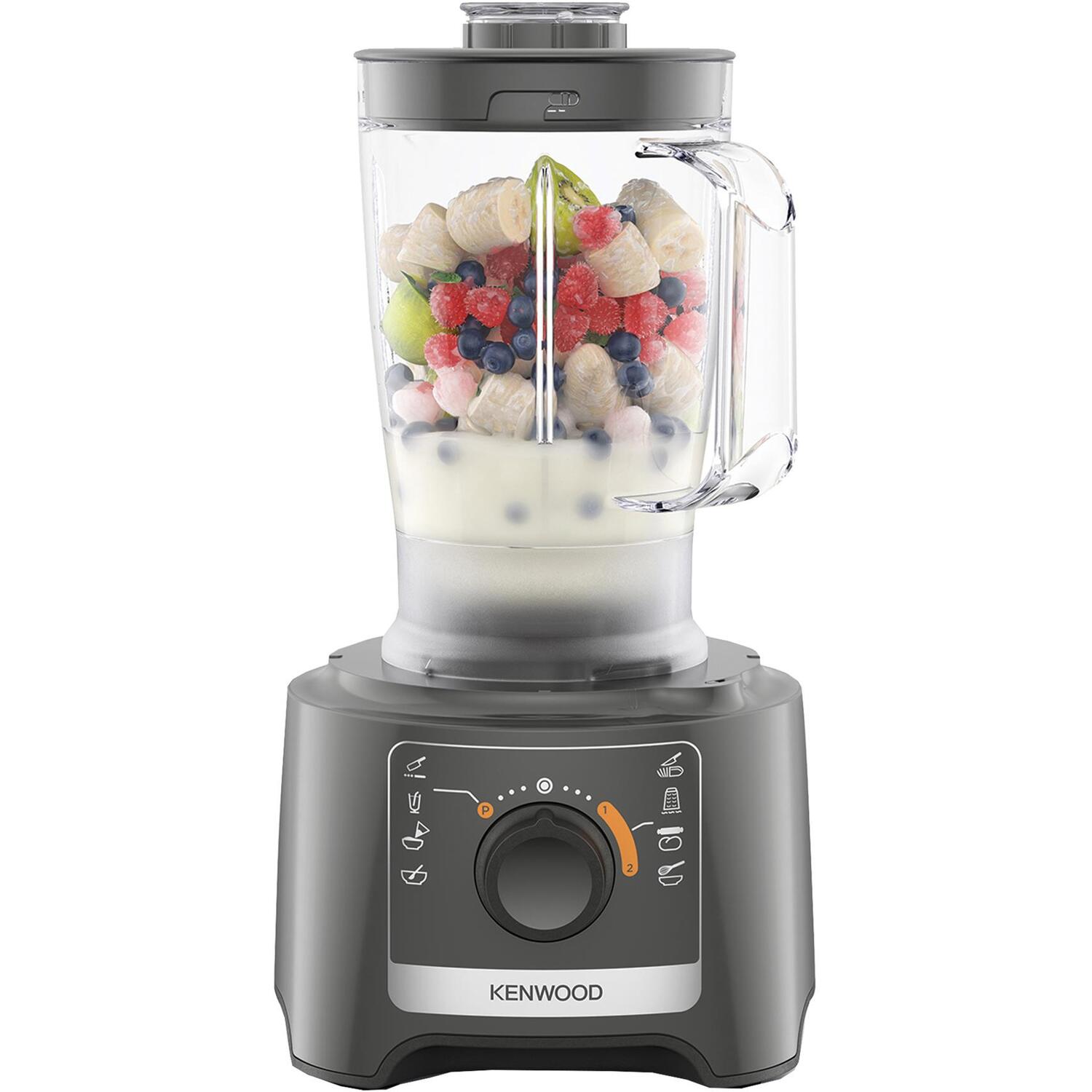 Introducing the Kenwood Everyday Essentials food processor with a power of 750W of power. It features a 2-speed setting and pulse function. The 1.8L blender attachment is ideal for creating smoothies, shakes, and soups. With a 2L bowl capacity and 1.2L working capacity for handling large quantities. Versatile interchangeable discs include a grating insert for coarse grating, a chip stick for thick chip sticks, a slicer insert for fine slicing, and an emulsifying disc for dough. The interchangeable blades consist of a chopper blade for chopping and pureeing, and a plastic blade for kneading bread and pastry mixes.