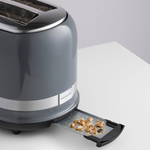 This grey toaster brings excitement to the kitchen, with a design that will immediately draw you in. With its retro design and fashionable grey colour, it will be the statement of your space. Matching kettle available