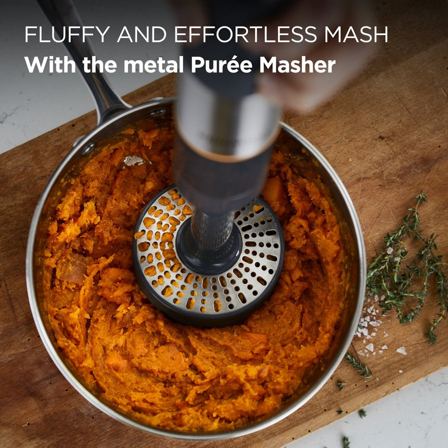 This premium hand blender offers superior blending performance with the Triblade™ XL blending wand, plus all the accessories you need to get creative in the kitchen. Including 500ml chopper, purée & masher, metal whisk and easy pour beaker.