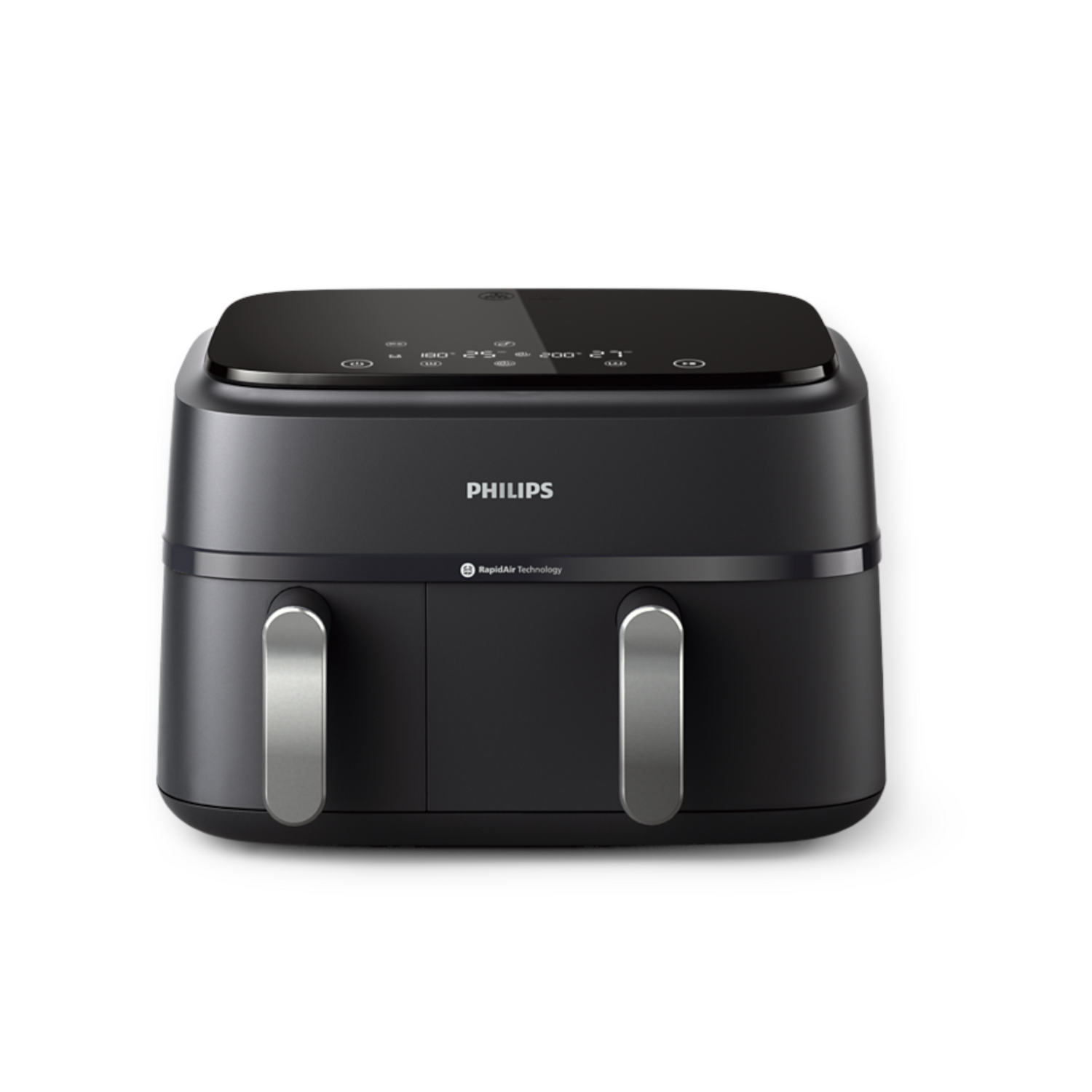 Indulge in perfectly balanced meals with the Philips 9 Litre Dual Basket Airfryer NA351. Using Rapid Air Technology, this elegant air fryer ensures crispy, tender, and evenly cooked food every time.