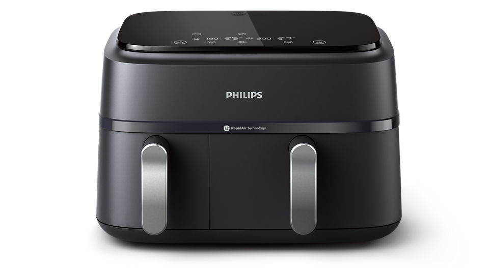 Philips 3000 Series Dual Basket Airfryer times your meal so two dishes are hot and ready at the same time. Enjoy tasty, healthy cooking with a large drawer for family-sized mains and a smaller one for sides or one person meals