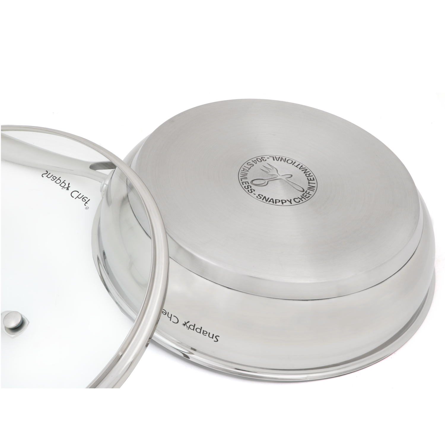Specifications SIZE ________________________________________ 26cm Ø x 6cm | 2.7litre Capacity WEIGHT ________________________________________ 4kgs SUITABLE FOR ________________________________________ WASHING ________________________________________ BODY ________________________________________ High quality 304 stainless steel 0.4mm thickness BASE ________________________________________ 3-layer 18/10 induction base 0.8mm thickness FINISH _______________________________________ Satin polish, riveted handle Dupont (R) 6-star Teflon coating LIDS _______________________________________ Flat glass lid Steel rimmed Oven safe up to 180°C
