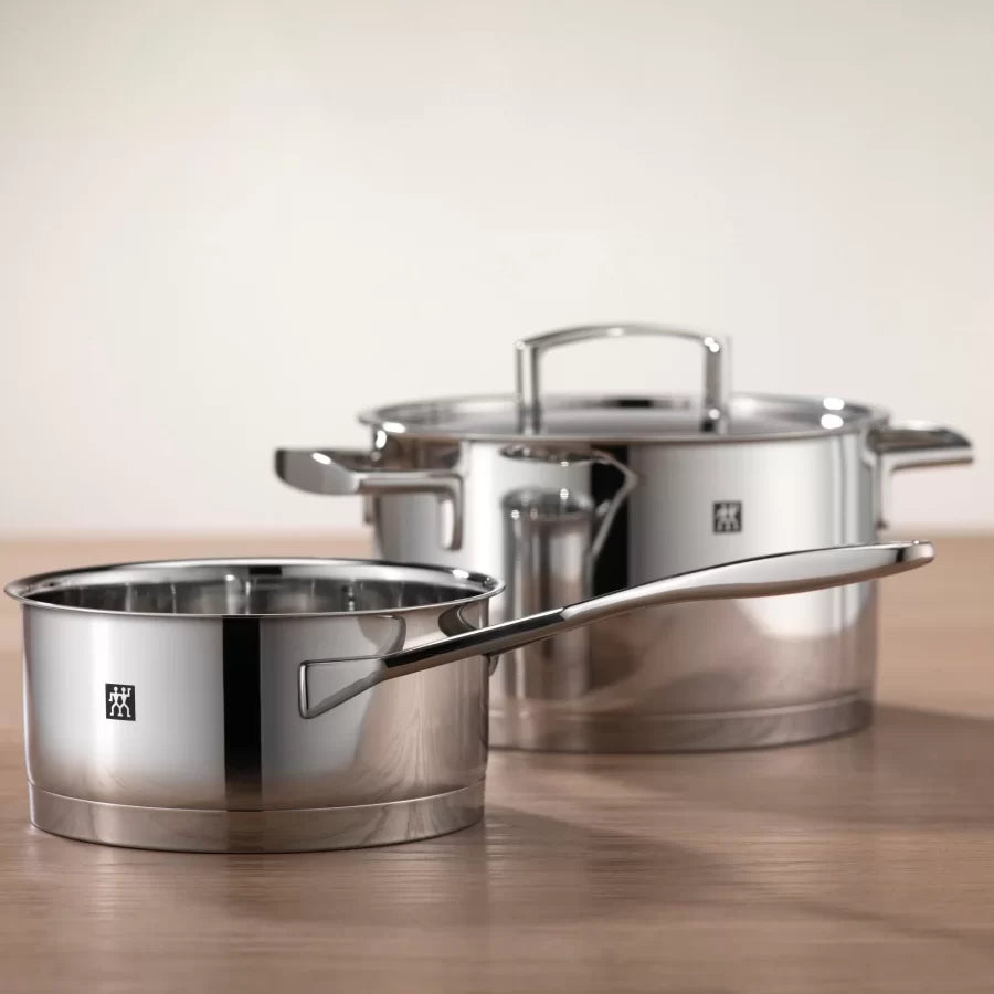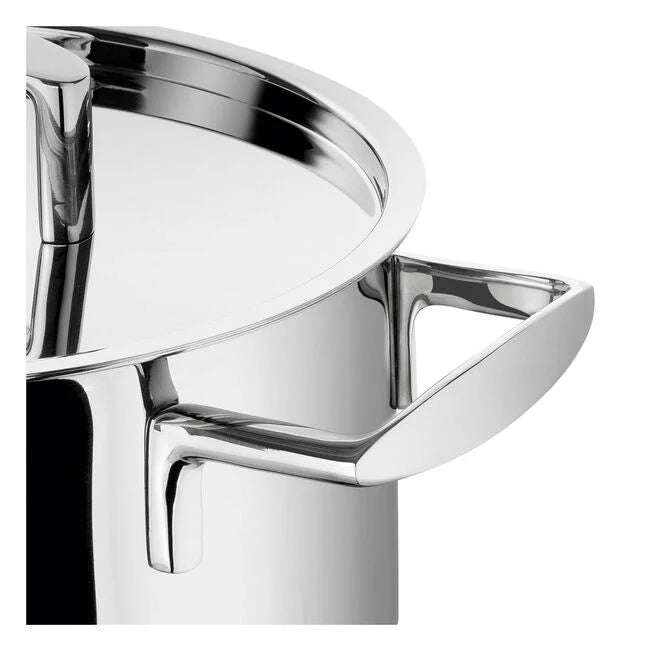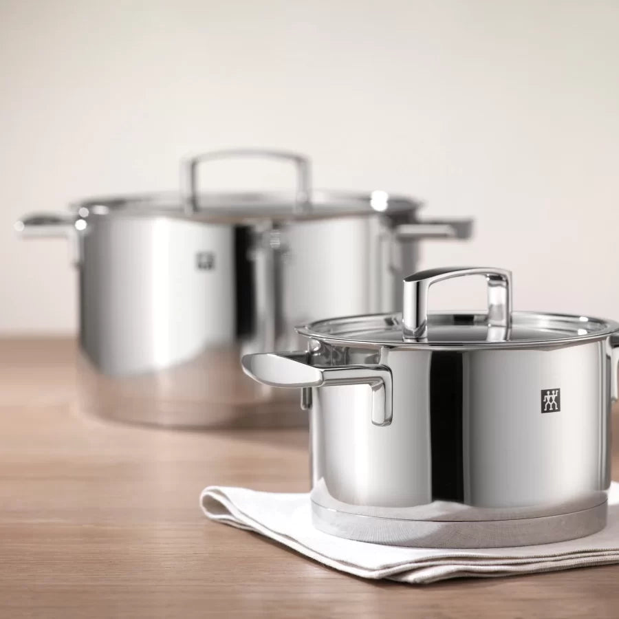 Always have the right pot at hand with a large stew pot, three pots in different sizes – all with a matching, snug-fitting lid – and a handy saucepan for sauces, milk or something else. Particularly practical is the integrated filling scale for measuring liquids. Ergonomically designed cast stainless steel handles simplify handling and remain cool even when the pot’s contents are simmering, thanks to the integrated stay-cool feature. The different pots can be used on gas, electric and, of course, induction hobs, and they save energy thanks to their special base. Incidentally, because they’re made with stainless steel, they can even be used in the oven.