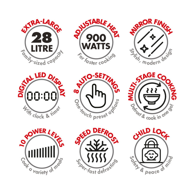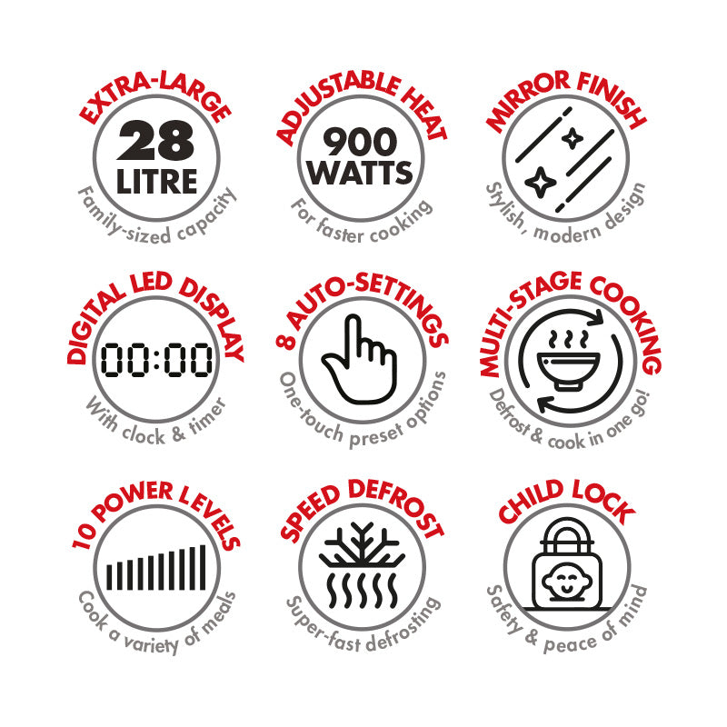 Steam, bakeĀ &Ā heatĀ to perfection! The Bennett ReadĀ® 28L Microwave is a versatile, large-capacity, multi-functional solution for quick and hearty family-sized meals. Premium design with stylish finsihes. With robust, duo-tone handle & stylish mirror glass door, this elegant, modern design will steal the show as an attractive addition to any kitchen. Digital LED display. With a variety of useful features, including an integrated clock & 99 minute cooking timer, to provide accurate info for all your cooking needs. One-touch preset buttons. Easy-to-use, convenient preset functions for cooking baked potatoes, pizzas, frozen dinners & more at the touch of a button. Programmable power levels & multi-stage cooking. Cook a variety of meals with precision using the 10 different programmable power levels. Multi-stage cooking allows you to defrost & cook meals in one go! Extended warranty. Your Bennett ReadĀ® 28L Digital Microwave comes standard with a 1 year warranty. Register your warranty online at www.bennettread.co.za and weāll extend it to a full 2 years.