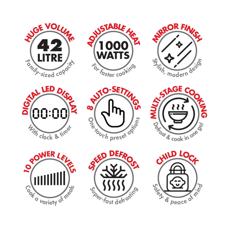 Expand your culinary horizons. The Bennett Read® 42L microwave has an enormous volume & state-of-the-art features to help you realise your ultimate cooking potential. Robust design with premium, stylish finishes. The sturdy, robust design is elegantly complimented by the duo-tone finish & stylish mirror glass door, elevating it to a standout in any kitchen. Digital led display. Monitor your masterpieces at a glance with a host of useful features like the integrated 99 minute timer & easy-to-read digital led display. One-touch convenience. Easy-to-use preset functions for cooking baked potatoes, pizzas, frozen dinners & more at the touch of a button for ultimate convenience! Programmable power levels. Cook a variety of meals with precision using the 10 different programmable power levels. Multi-stage cooking allows you to defrost & cook meals in one go! Extended warranty. Your Bennett Read® 42l microwave comes standard with a 1 year warranty. Register your warranty online at www.bennettread.co.za and we’ll extend it to a full 2 years.