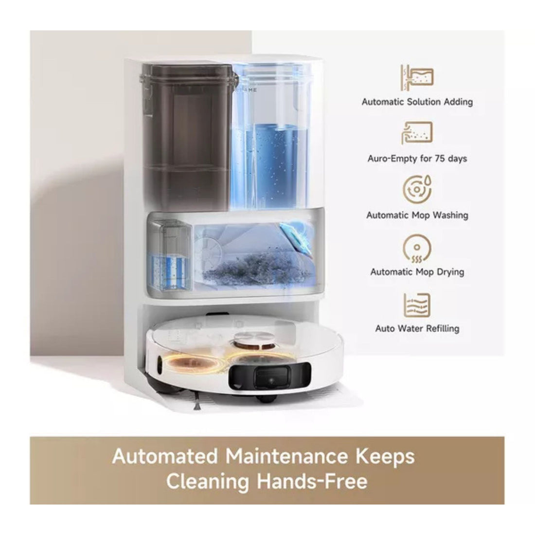 - Self-Cleaning and Auto-Emptying: Features a base station that automatically empties the dustbin and cleans the mop pads, reducing manual intervention.