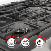 Elevate Your Cooking Experience. The Bennett Read Fusion 90 is a versatile freestanding gas/electric stove designed for modern home chefs. With cutting-edge technology & exceptional durability, this 90cm stove delivers top-tier performance for all your cooking needs. Powerful & Spacious. Equipped with 5 high-performance burners, including a powerful Triple Flame Wok Burner, the Bennett Read Fusion 90 makes multitasking in the kitchen effortless. The extra-large 90cm oven provides ample space for roasting, baking, & everyday & extended family-sized meals, while the integrated fan ensures even heat distribution for perfectly cooked results. Built for Strength & Stability. Designed to withstand high heat and daily use, heavy-duty cast iron supports provide a solid foundation for your pots & pans. Plus, adjustable feet ensure stability on any kitchen surface, keeping your cooking experience safe & steady. Precision & Safety. The push-button electric ignition guarantees a quick & effortless start for the gas burners. Equipped with Flame Safety Technology, the stove automatically shuts off the gas supply if the flame goes out, offering enhanced protection for your home.