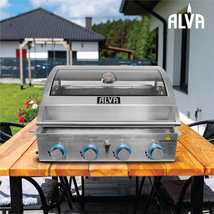• Whether you're grilling up steaks, burgers, or vegetables, the ALVA Mojave 4-Burner Glass Hood Drop-In Gas BBQ is the perfect addition to your outdoor cooking setup