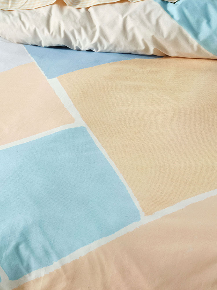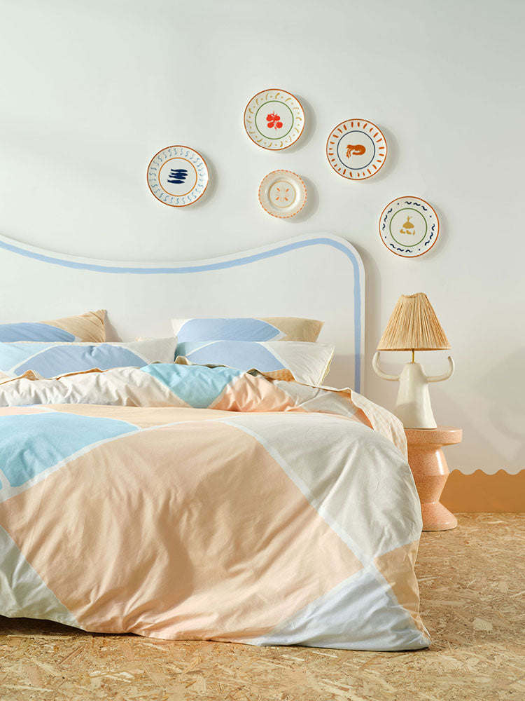 A hand-painted marquetry-style geometric, Orissa is calming yet commanding with its grand scale. Its serene blue and clay palette fosters an oceanic quality, which perfectly encapsulates those summer getaway vibes. Pair this cotton percale set with coordinating scatters to complete this aesthetic.