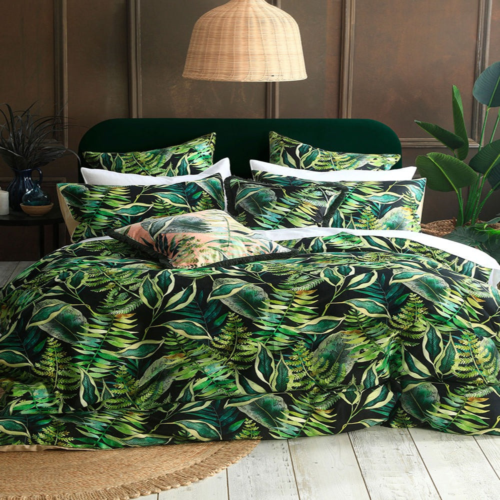 A luscious hand painted tropical leaf design that’s sure to be a favourite this season! Style with textured cushions in complementary colours.