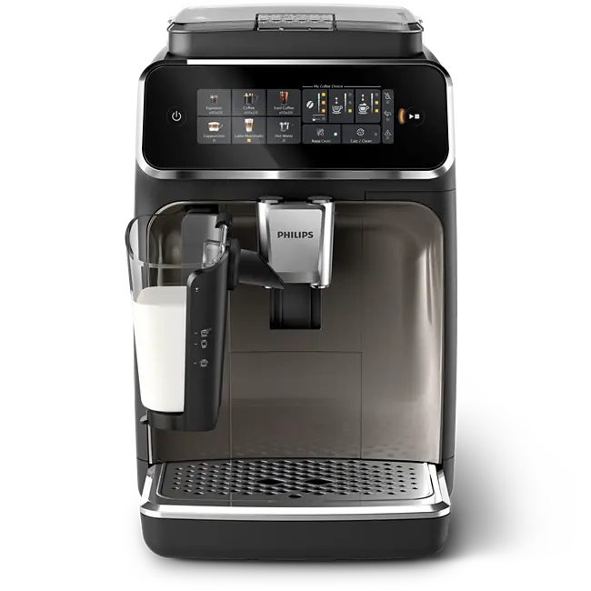 Enjoy 5 popular coffee recipes, from classic espresso, regular black coffee, cappuccino, latte macchiato, to iced coffee.LatteGo is the fastest to clean milk system with only 2 parts, no tubes and can be cleaned in 10 seconds under tap or in the dishwasher.40% quieter with SilentBrew, same delicious coffee.Up to 5000 cups** without descaling thanks to Aquaclean.Enriched flavor with our hard-wearing ceramic grinder. Easily select your favorite drinks thanks to the modern touch screen display with colored icons. Easy instructions and inspiration with the HomeID App