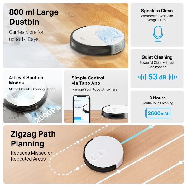 - Simple Control via TAPO App - Tailor scheduling and switch clean modes at home or away.