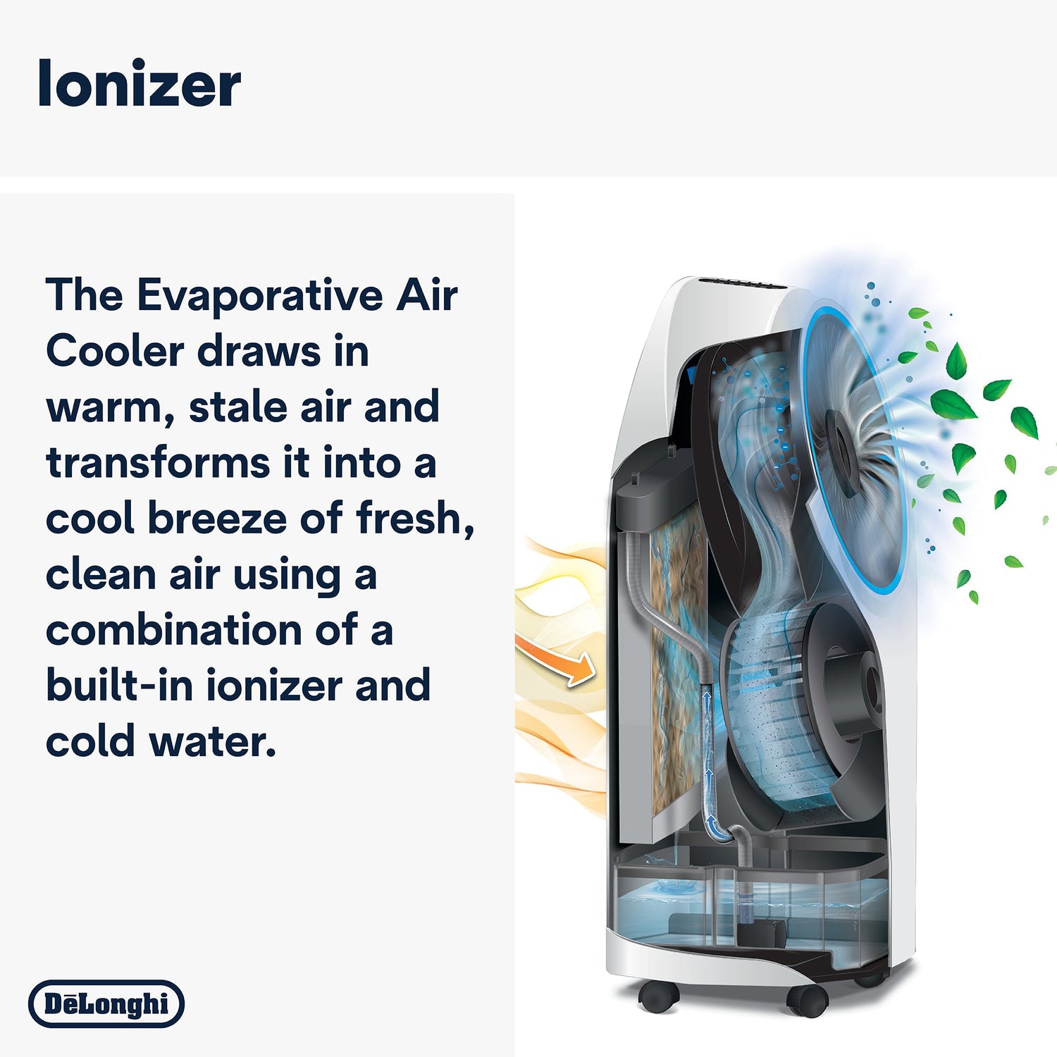 The EV250 Portable Evaporative Air Cooler draws in warm, stale air and transforms it into a cool breeze of fresh, clean air using a combination of a built-in ionizer and internal water chamber. You can even speed up the process with the help of the provided ice pack that can be filled, frozen and then placed in the water chamber. Three fan speeds, three wind modes, adjustable louvres and an internal swing mode allow you to customize the circulation of the cool, fresh air created by this energy-efficient machine. Sitting on castors, it is simple to relocate the EV250 anywhere in the house. Operation is easy using either the controls on top of the unit or the full-featured remote control. Optimized for use in hot, dry climates with relative humidity , but the Portable Evaporative Cooler will also provide a cooling breeze in higher-humidity climates.