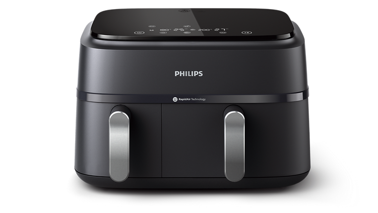 Indulge in perfectly balanced meals with the Philips 9 Litre Dual Basket Airfryer NA351. Using Rapid Air Technology, this elegant air fryer ensures crispy, tender, and evenly cooked food every time.