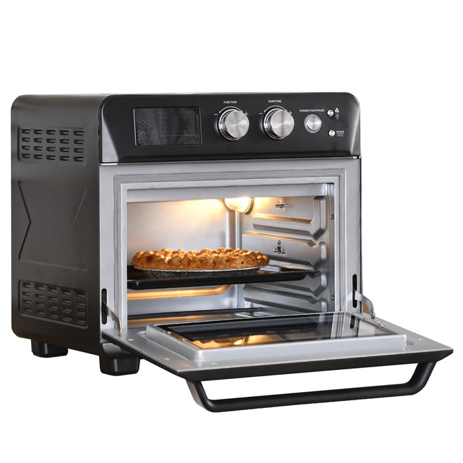 The 25L Air fryer oven has a built-in rotisserie function for roasting a full chicken and 15 pre-set cooking modes that include frying, roasting, defrosting, heating, grilling, and drying with just one touch.