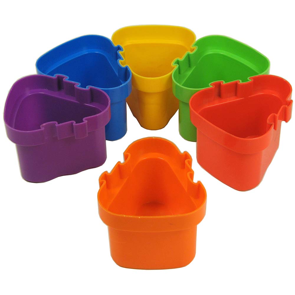 Set of 6 plastic connector pots in assorted colours for water, storage or paint.