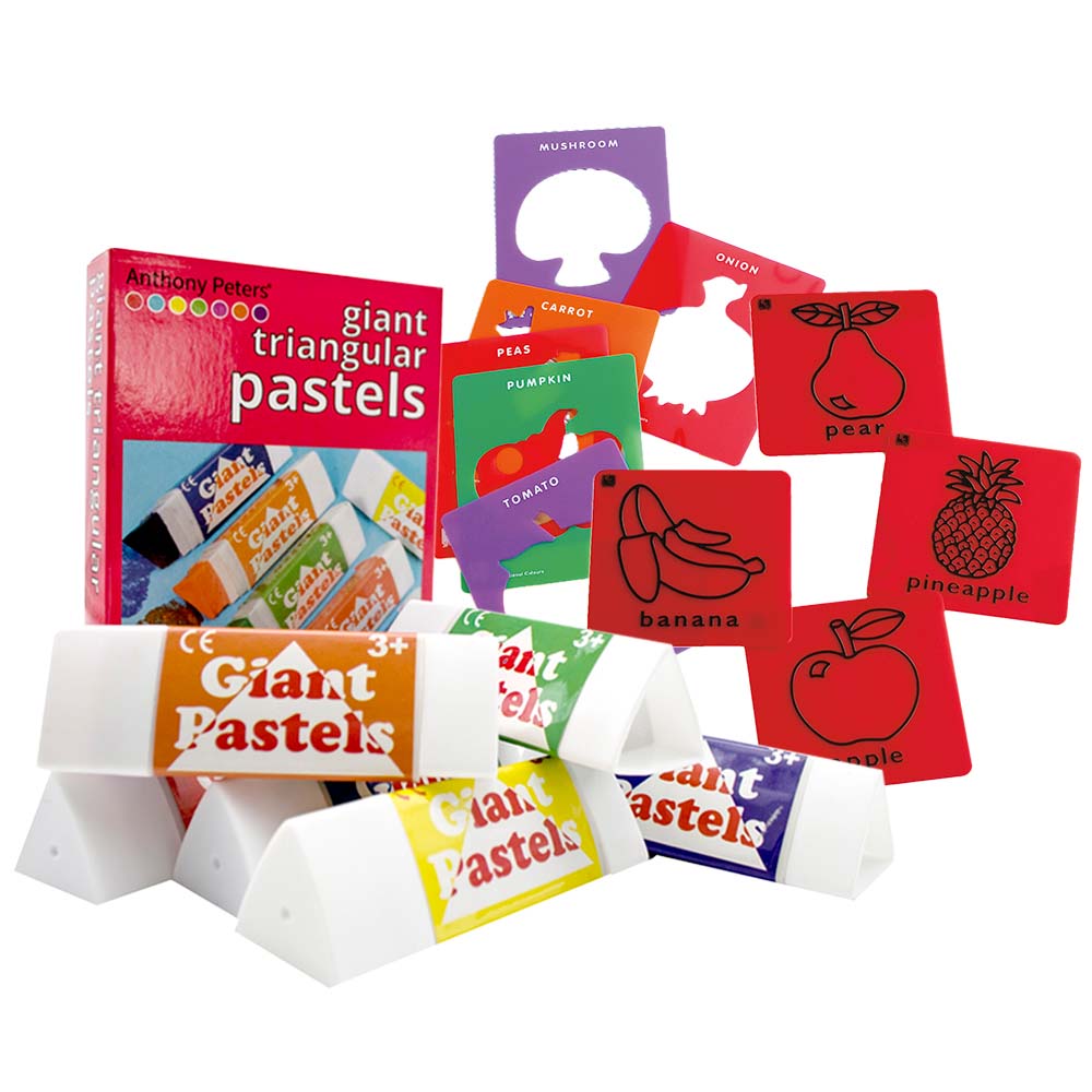 A great set to promote your child's fine motor skills, this all encompassing arts and crafts kit including giant triangular pastels, fruit rubs and vegetable stencils sets the scene for a fun and creative art project!