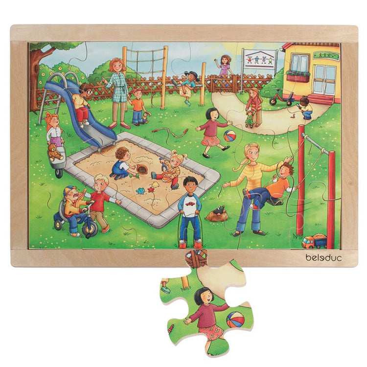 A Beleduc 24 Piece Frame Puzzle. Each puzzle in the series is illustrated with images of daily situations. These scenes invite children to talk and exchange their experiences thereby encouraging speech development, assignment skills, hand-eye coordination, fine motor skills and social behaviour. The wooden frame is provided so that your young one can position the puzzle pieces.
