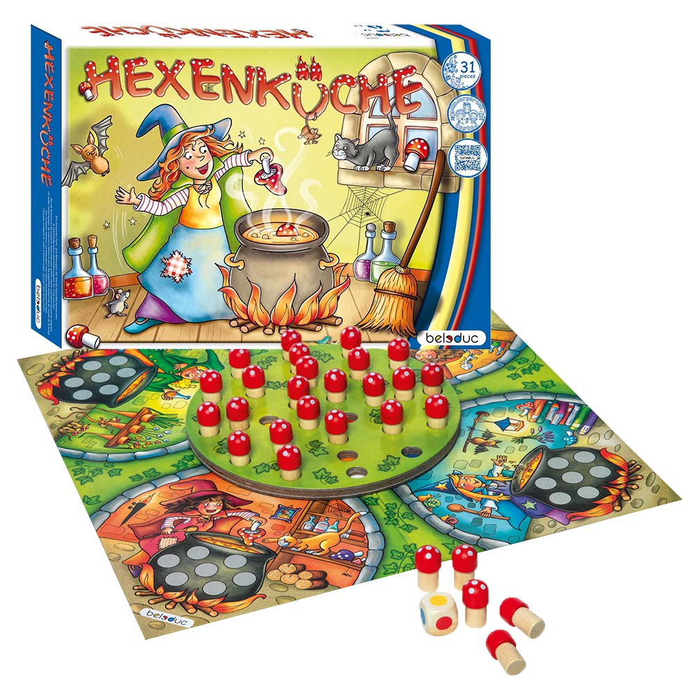 The little potion brewing experts search under mushrooms for dots in the same colour that comes up on the die. If the colour under the mushrooms is the same as that shown by the thrown die, the player may put the mushroom into his/her own cauldron. The first player to fill his/her cauldron with the 7 mushrooms is the champion potion brewer.