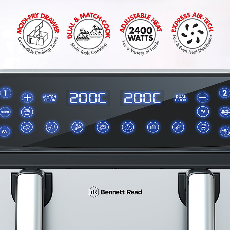 Master multi-tasking in the kitchen. The 10.5L Triple Zone Air Fryer comes equipped with a versatile 3-zone modi-fry draw, allowing you to cook 1 large meal, or 2 separate food types, in 2 different ways simultaneously. Featuring 12 preset functions & Express Air-Frying Technology, this appliance makes multi-tasking in the kitchen quick, effortless, & effcient. Intuitive digital design. With sleek Digital-Touch Display, 12 Preset Functions, adjustable time & temperature controls, & a Pre-Heat feature for added convenience. Hassle-free cleanup. Equipped with dishwasher-safe*, non-stick Drawer, Removable Divider & Detachable Fry Tray for easy cleaning. Wholesome, homestyle cooking. With Express Air-Frying Technology, this kitchen marvel lets you cook your favourite dishes & snacks** using up to 80% less oil & fat. Extended warranty. Your Bennett Read® 10.5L Triple Zone Air Fryer comes standard with a 1 year warranty.