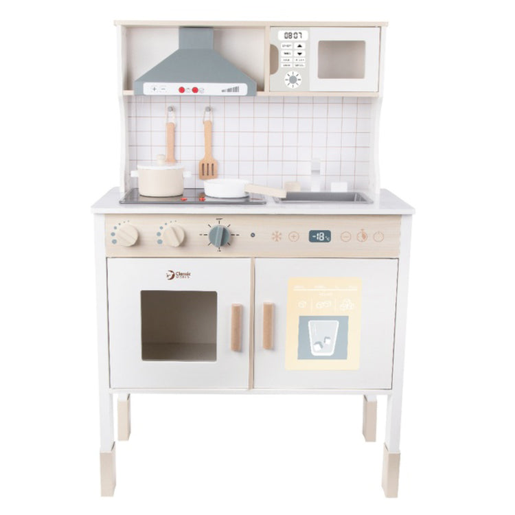 This modern kitchen comes with many play values to make the cooking experience fun. It includes a microwave, oven, sink, and cooking accessories. It also has an electric plate with sound effects! Children can fully experience the fun of being a chef.