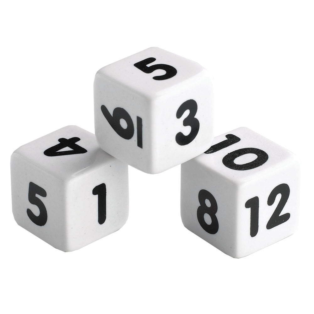 White plastic dice with black numbers, ideal for all sorting, addition, subtraction and probability activities.