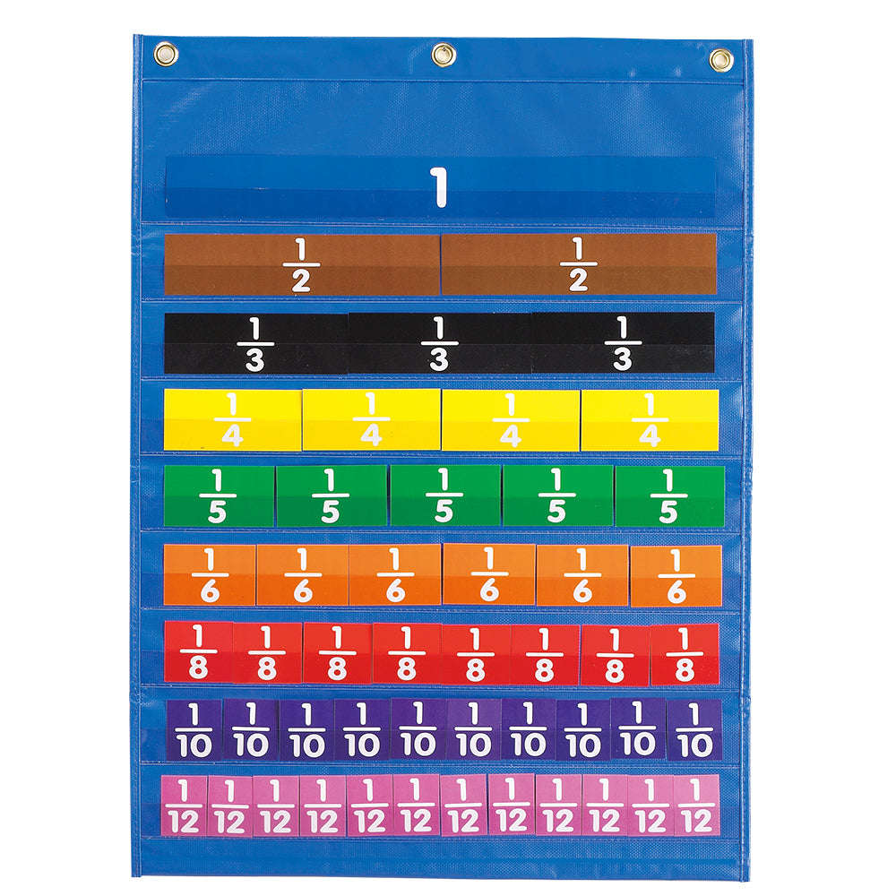 Build your own fraction wall using the pocket chart. Learn about equivalent fractions. Make links between fractions, decimals, and percentages by swapping the colour coded cards over. Heavy-duty pocket chart complete with three sets of colour coded cards that work with our fraction tiles, percentage tiles, and the decimal tiles.