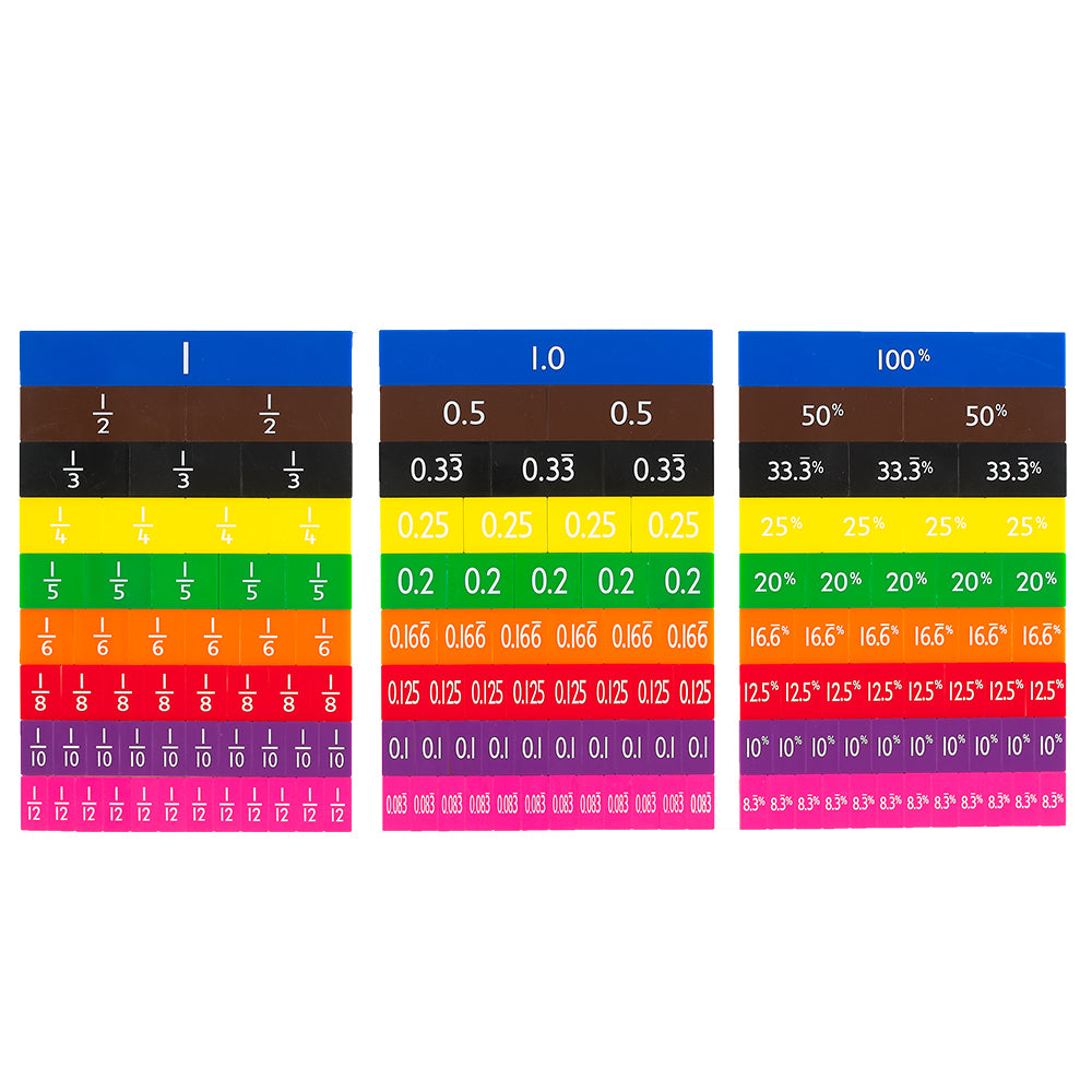 A set of 153 proportionally-sized pieces representing a whole, halves, thirds, quarters, fifths, sixths, eighths, tenths & twelfths in 9 distinct colours. A fantastic tool for teachers when teaching mathematics concepts.