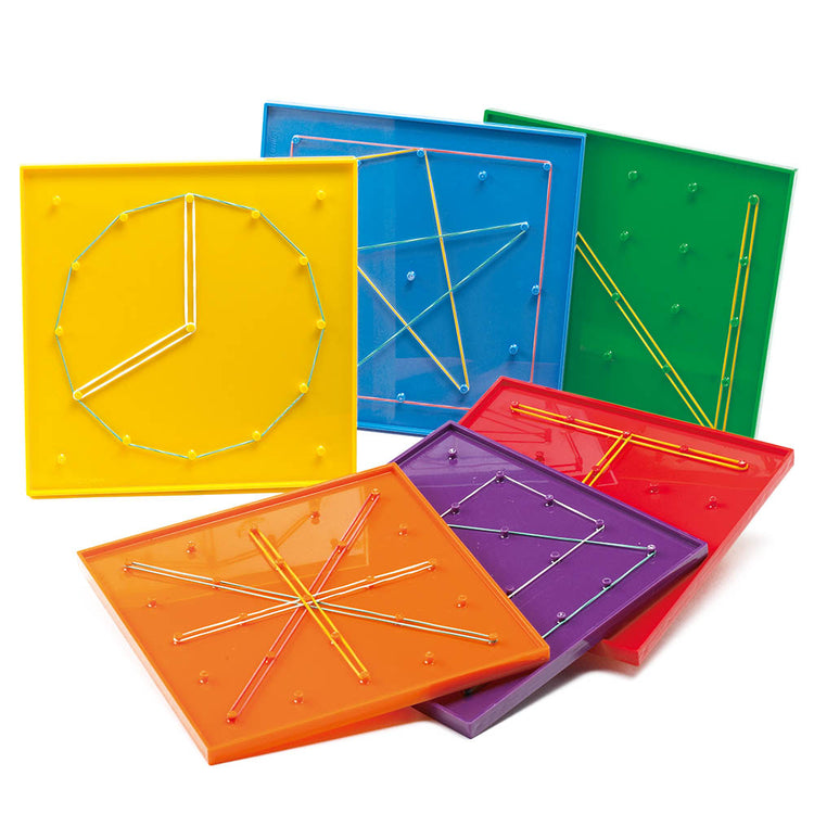These double-sided 12.5cm square geoboards come in 6 bright colours. One side with 12-pin circle and reverse side with 5x5 pin grid. Each geoboard as a wide easy stand edge, 6 pieces in a set, 120 elastic bands.