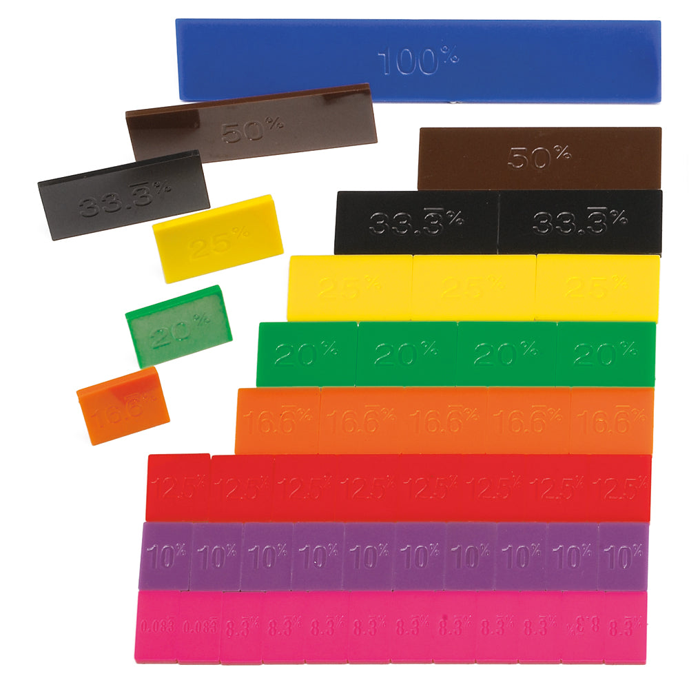 A set of 51 proportionally sized pieces representing a whole, halves, thirds, quarters, fifths, sixths, eighths, tenths and twelfths in 9 distinct colours with printing on each piece.