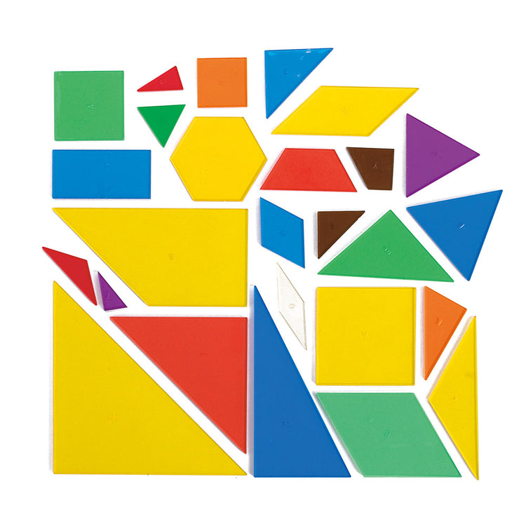 Different plastic geometric shapes used to investigate geometry - area, and fraction concepts. Explore the properties of shapes to determine whether two shapes are congruent or similar.